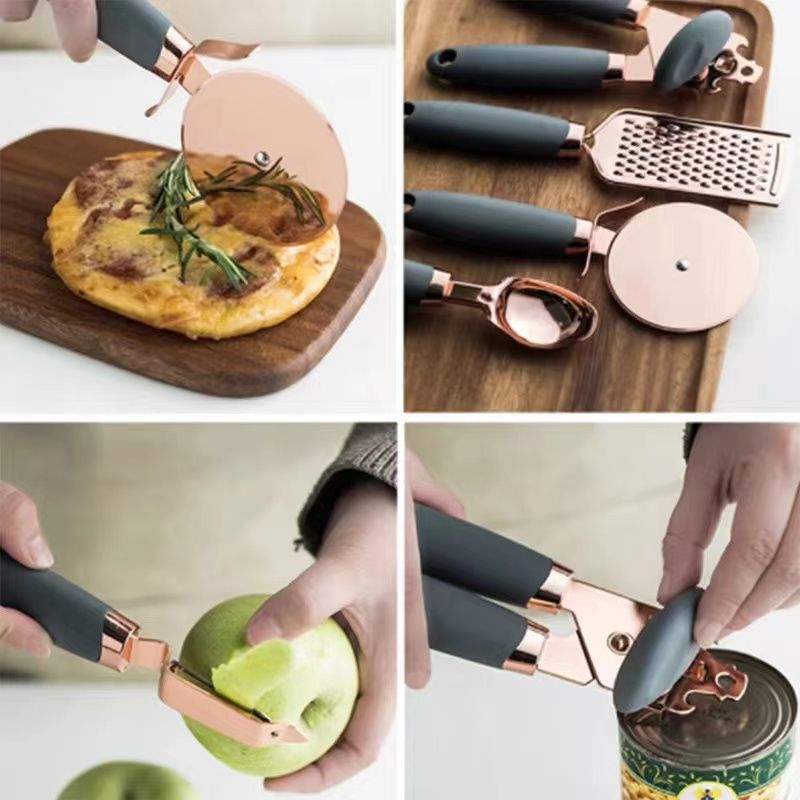 Kitchen cook utensils gadget set copper coated stainless steel kitchenware with non-slip handles(ice scream scoop peeler garlic press cheese grater whisk can opener pizza cutter